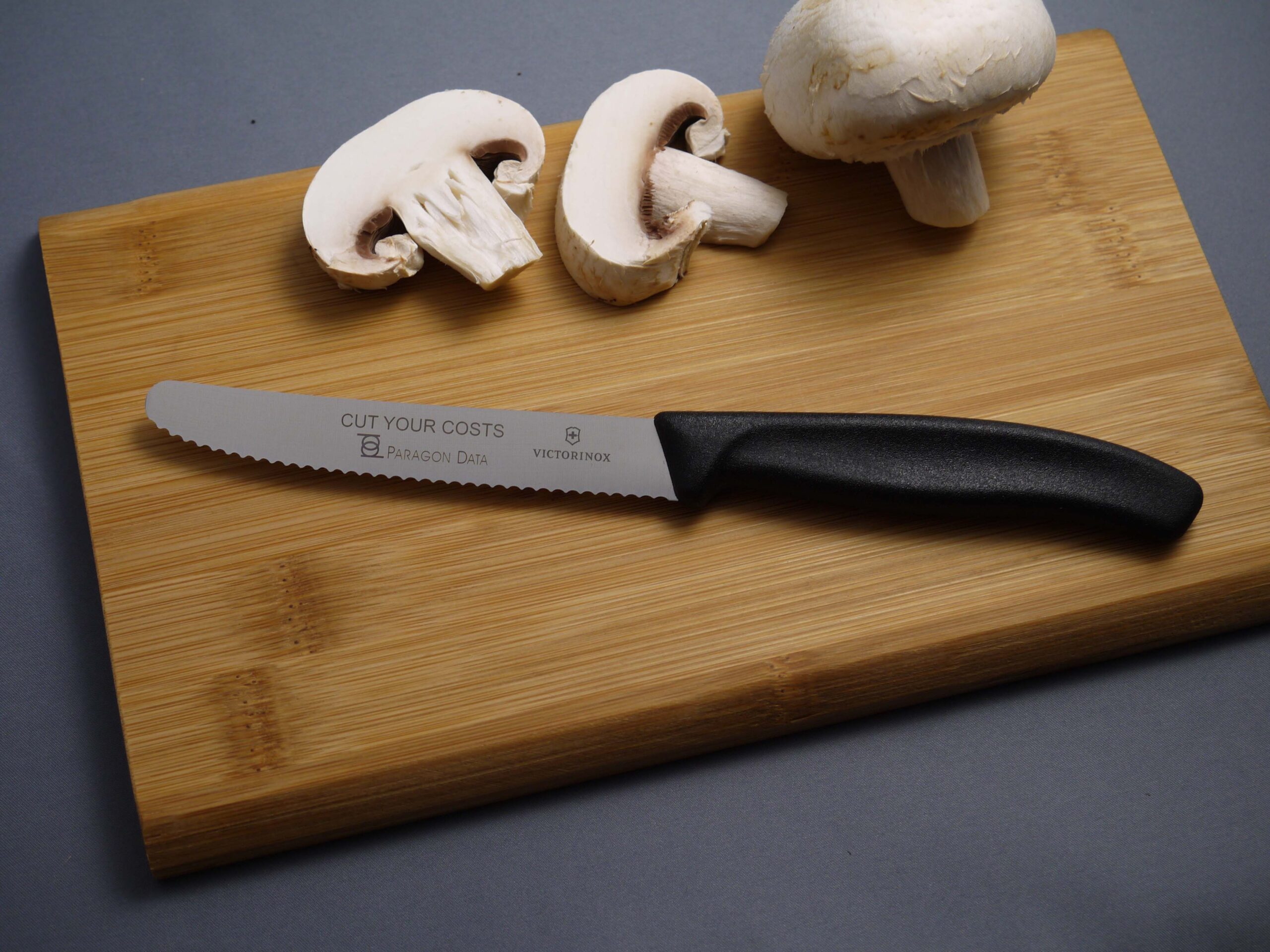 Original Victorinox Tomatenmesser mit schwarzem Kunststoffgriff und rostfreier Wellenschliffklinge. Auf der Abbildung ist zusätzlich eine Kundenwerbung angebracht. Dies ist bei größeren Auflagen gegen Aufpreis möglich.