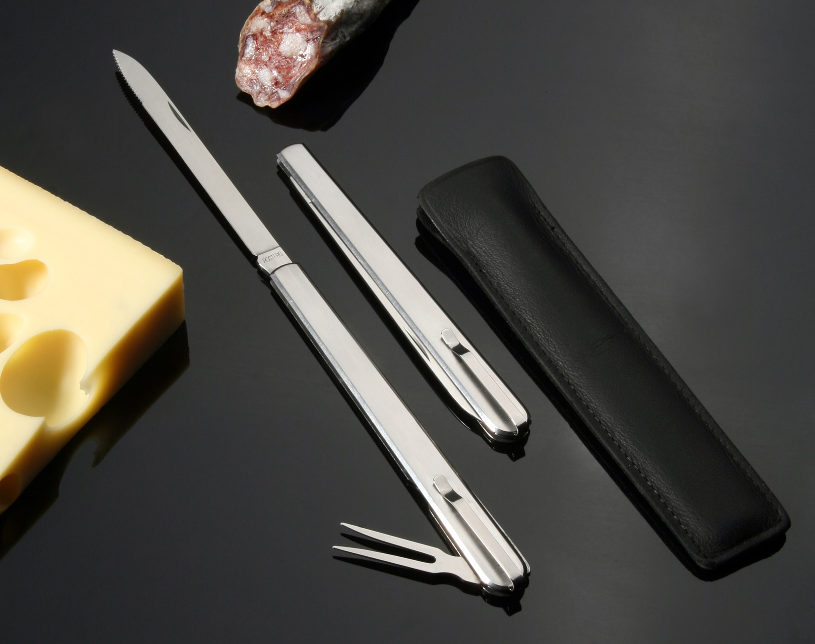 Wurstprobiermesser mit rostfreier Klinge und Stahl-Griffschalen, satinierte Oberfläche, Klinge mit Anritzsäge, Probiergabel mit Clip. Dieses Messer wird auch sehr gerne als Campingmesser eingesetzt. Ein vielseitiger Begleiter auf Wanderungen und beim Picknick.